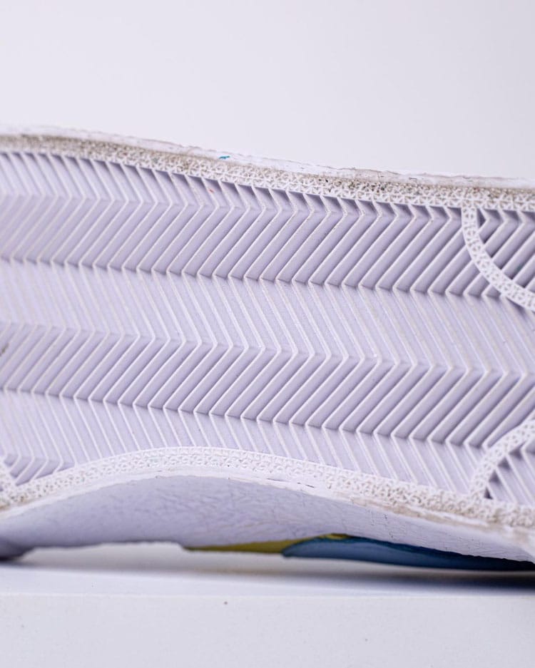 Thiết kế phần đế da xếp chồng lên nhau của Chitose Abe là điểm nhấn của đôi Blazer cổ thấp cùng lỗ xỏ dây, dây giày, lưỡi gà nhiều lớp.