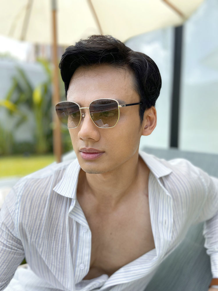 Với vẻ ngoài điển trai, Minh Khắc chọn cho mình chiếc kính mát màu nâu trà với thiết kế bắt mắt, viền kính được cách điệu nổi bật tạo sự trang nhã, thanh lịch phù hợp với khuôn mặt chữ điền của anh chàng này đây.