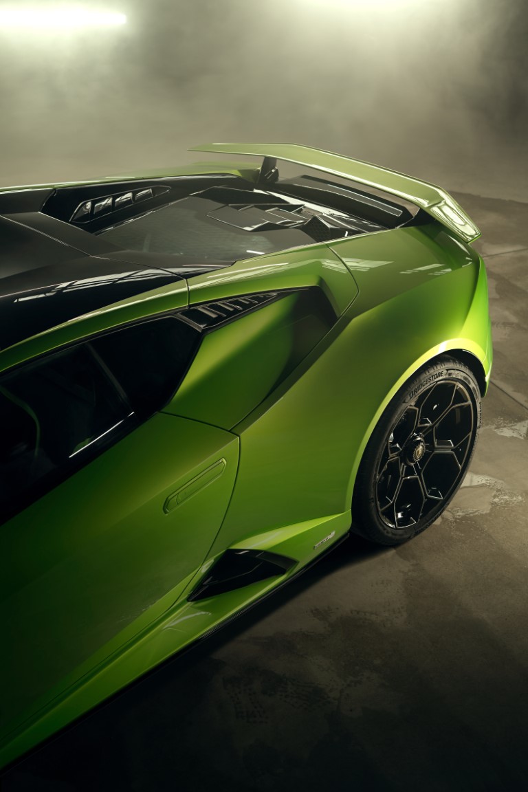 Kết cấu đuôi xe mới mang đến hiệu quả tối ưu hóa khí động học, đi kèm tùy chọn màu sơn dành cho bộ khuếch tán cản sau. Hệ thống ống xả hình lục giác là biểu hiện rõ ràng nhất cho sức mạnh từ khối động cơ V10 hút khí tự nhiên của Huracán Tecnica.