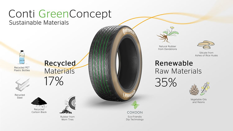 Conti GreenConcept – ý tưởng mới nhất của hãng lốp danh tiếng Continental, thể hiện tầm nhìn tương lai về những chiếc lốp xanh khi hơn một nửa nguyên liệu thô cấu thành đều là nguồn nhiên liệu tái chế như cao su tự nhiên từ cây bồ công anh, silicat từ tro trấu, dầu thực vật và nhựa, chỉ 17% nguyên liệu thép và carbon. Điều này cho phép “giảm đáng kể” nguyên liệu làm từ dầu thô, giảm sức ép lên gành công nghiệp dầu mỏ đang khánh kiệt dần.