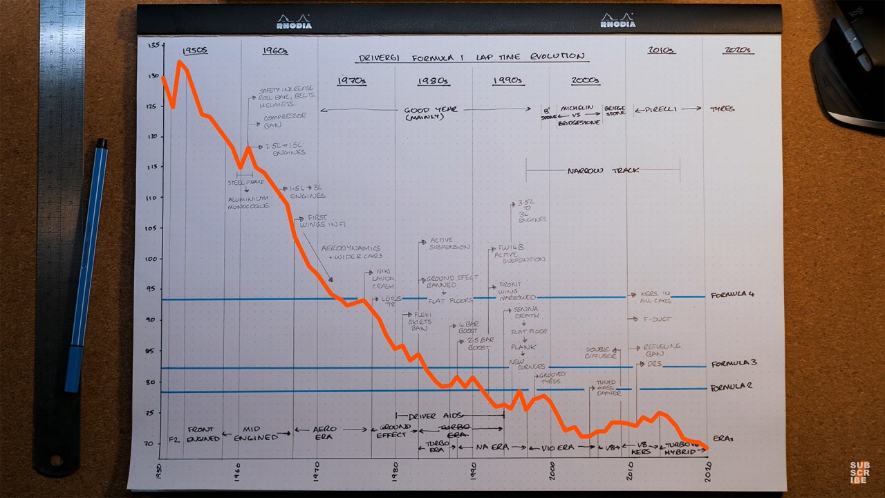 Driver61 đã lập một biểu đồ thời gian hoàn thành hết một vòng đua nhanh nhất từ mọi cuộc đua của mọi mùa giải cho đến nay để thể hiện được sự khác biệt về tốc độ cho mỗi năm. Để tăng tính hữu ích của biểu đồ này, các yếu tố khác cũng được lưu ý đến như luật đua, thời tiết,…